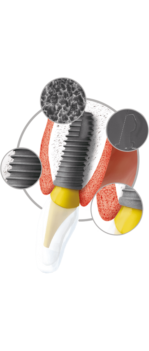 Yüksek başlangıç kararlılığı için tasarım • Çift konik tasarımlı implant gövdesi (Düzenli ve Geniş) Düz gövde ve konik kafa tasarım...